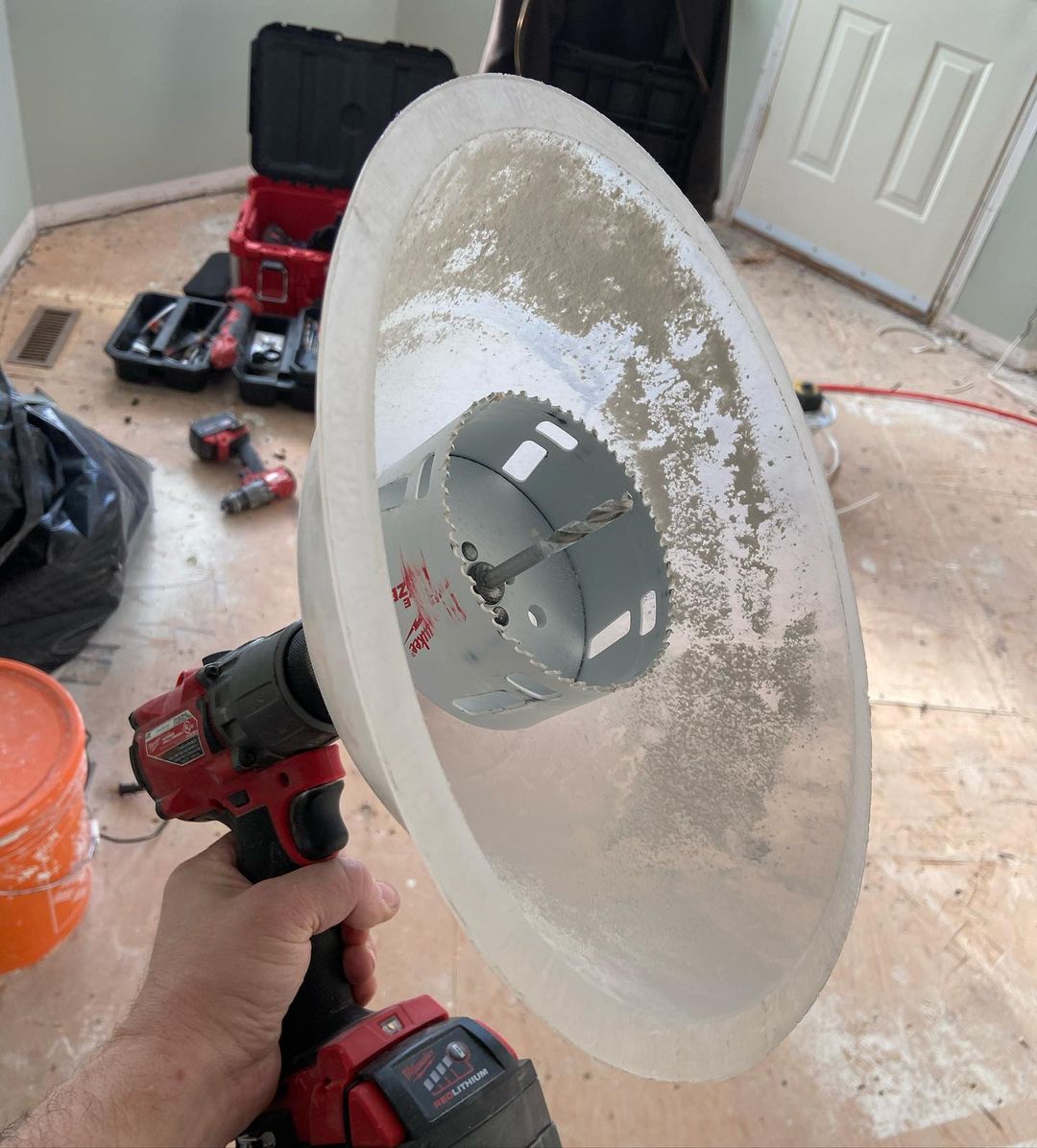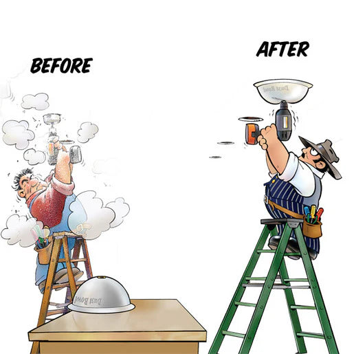 Combine the Driller’s Dust Bowl with Rack-A-Tiers hole saws and the Rack-A-Tiers Exploding Garbage Can Ultra for the ultimate recessed lighting installation setup.