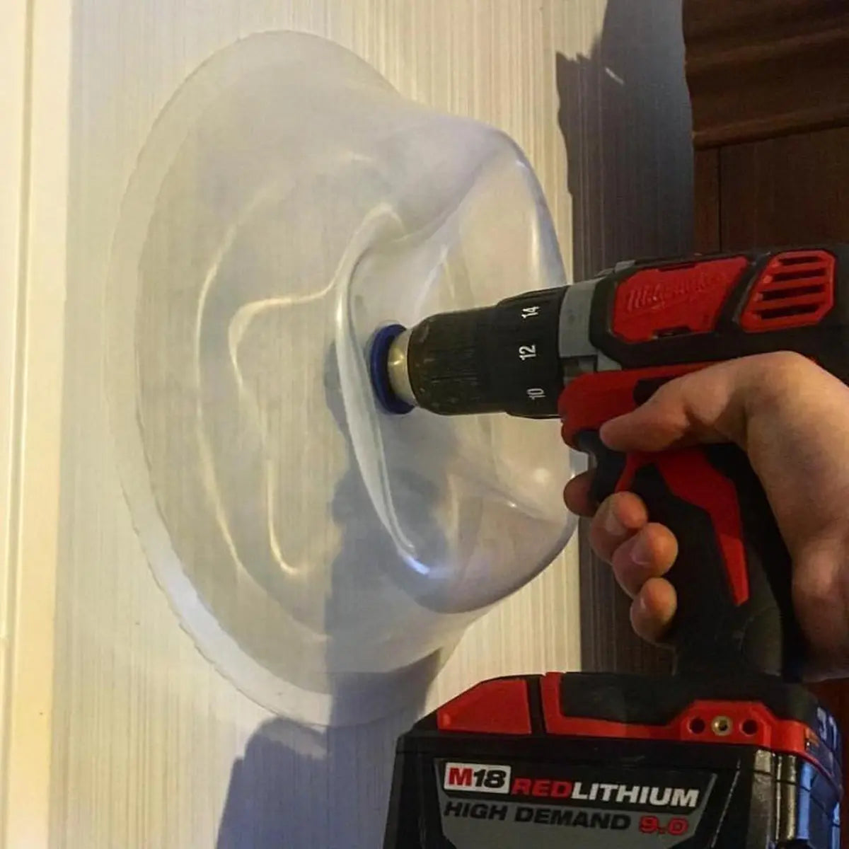 - Place the pilot bit where you want to drill and press the Dust Bowl’s flange against the surface.