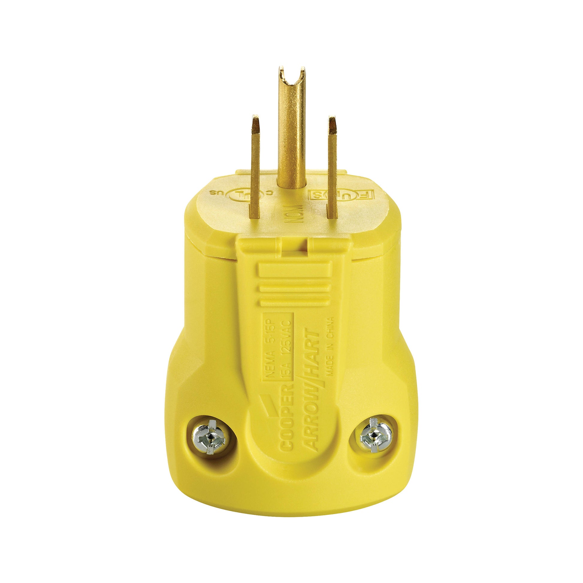 Eaton Arrow Hart quick grip straight blade plug, #18 to #12 AWG, 15A, Industrial, 125V, Back wire, Yellow, Brass, Nylon, 5-15P, Two-pole, three-wire, grounding, Screw, 0.22-0.66" in diameter, Nylon, Core pack