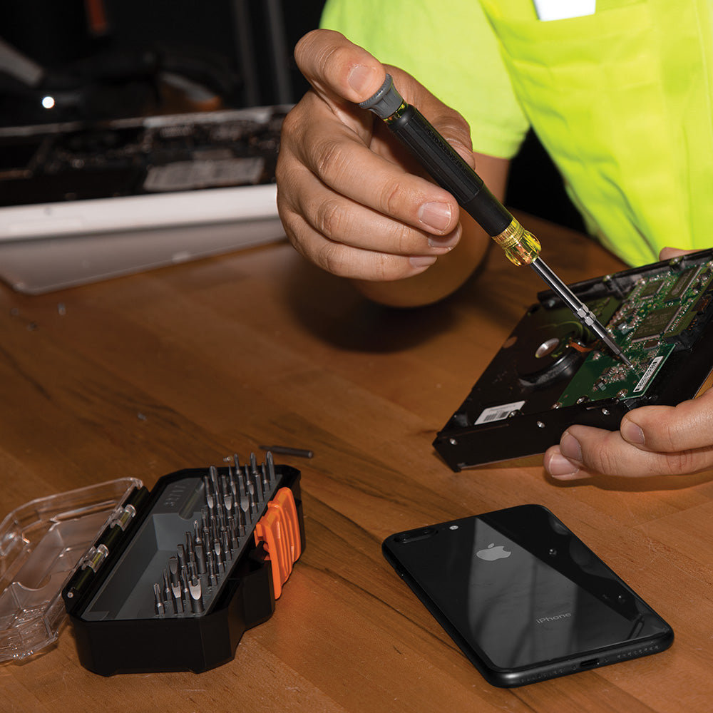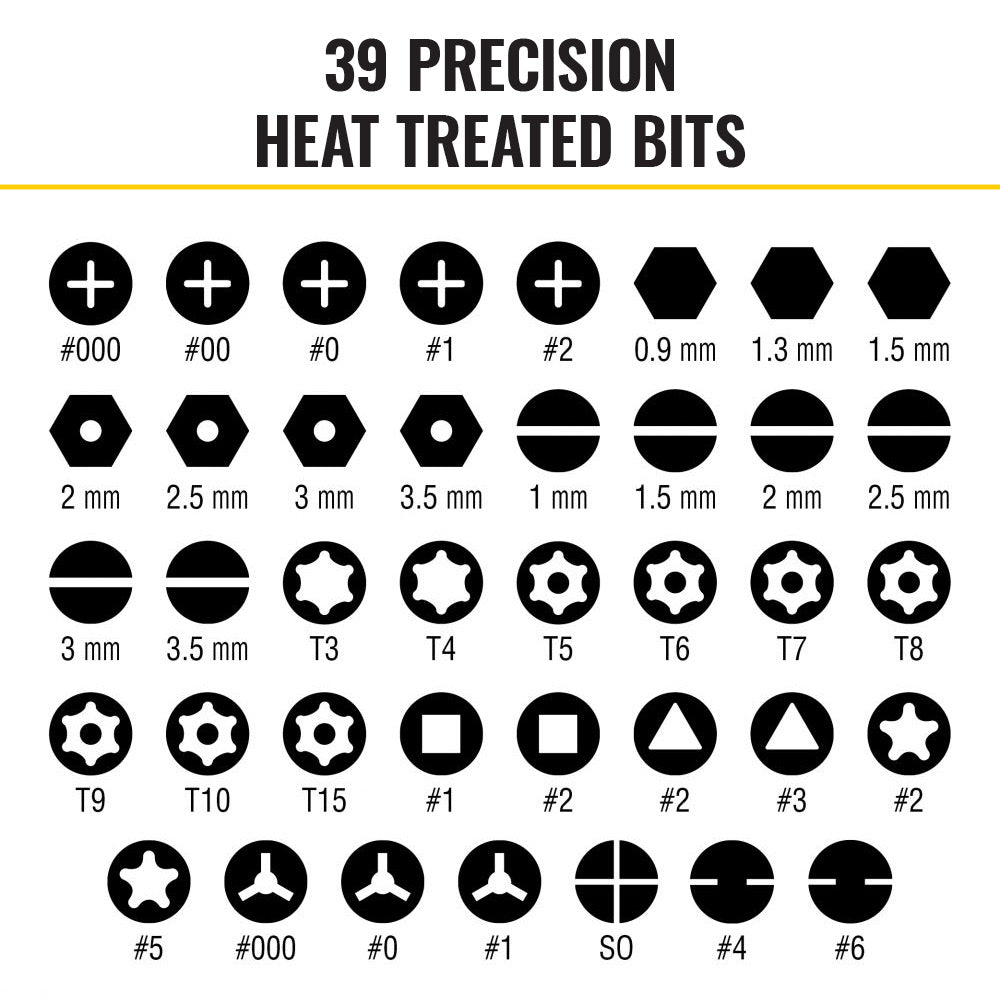 Klein Tools’ All-in-1 Precision Screwdriver Set with compact carrying case features 39 precision bits. This set provides everything you need to work with electronics and precision fasteners including those for Apple® products such as Apple® iPhone, MacBook, and Watch. The reversible barrel is standard on one side and extra-long on the other for those hard-to-reach jobs. Powerful magnets housed in the barrel better secure the bit, which also allows it to easily pick-up and retain fasteners. The Cushion-Grip™ handle and spin cap provide outstanding comfort and control.