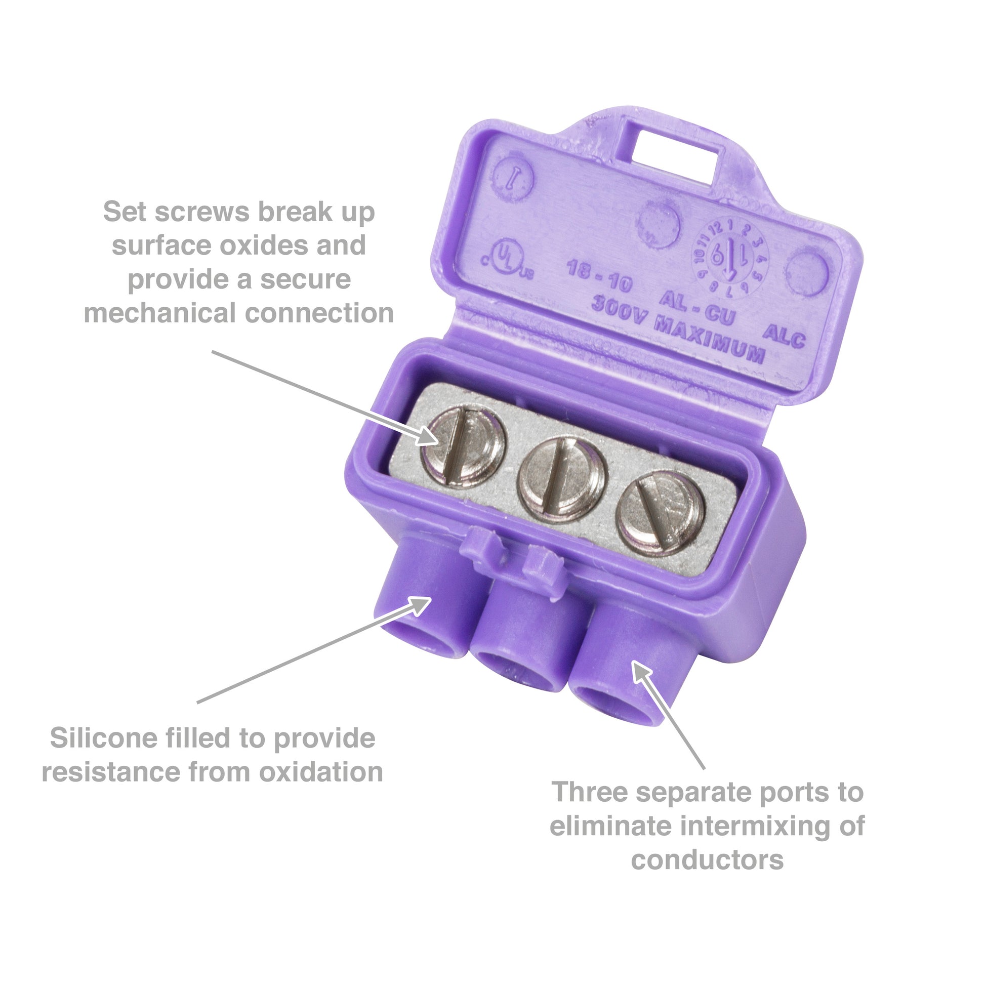 King Innovation's AlumiConn Aluminum to Copper Lug is approved by the Consumer Product Safety Commission (CPSC), UL, and numerous insurance companies as a safe method for aluminum wiring repair. Manufactured in Missouri, AlumiConn is a lug style connector with three separate ports to eliminate intermixing of conductors. It coats aluminum wires with a thin layer of silicone sealant to provide resistance from oxidation, and uses set screws to break up surface oxides and provide a secure mechanical connection. Avoid a complete re-wire by using AlumiConn, the most cost-effective aluminum wiring repair solution available.