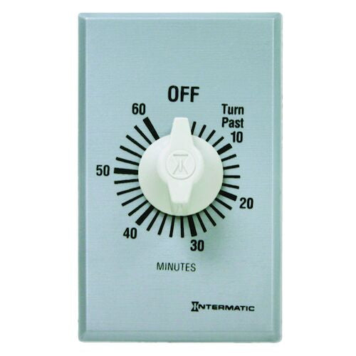 The FF Series Commercial Countdown Timers are designed to replace any standard wall switch and do not require electricity to operate. These energy-efficient switches automatically limit the ON times for fans, lighting, motors, heaters, and other energy consuming loads. A commercial "brushed metal" look plate (plastic construction) meets NEC requirements. *NOTE: Not for use with sunlamps, saunas, or loads that could cause personal injury if timed incorrectly.