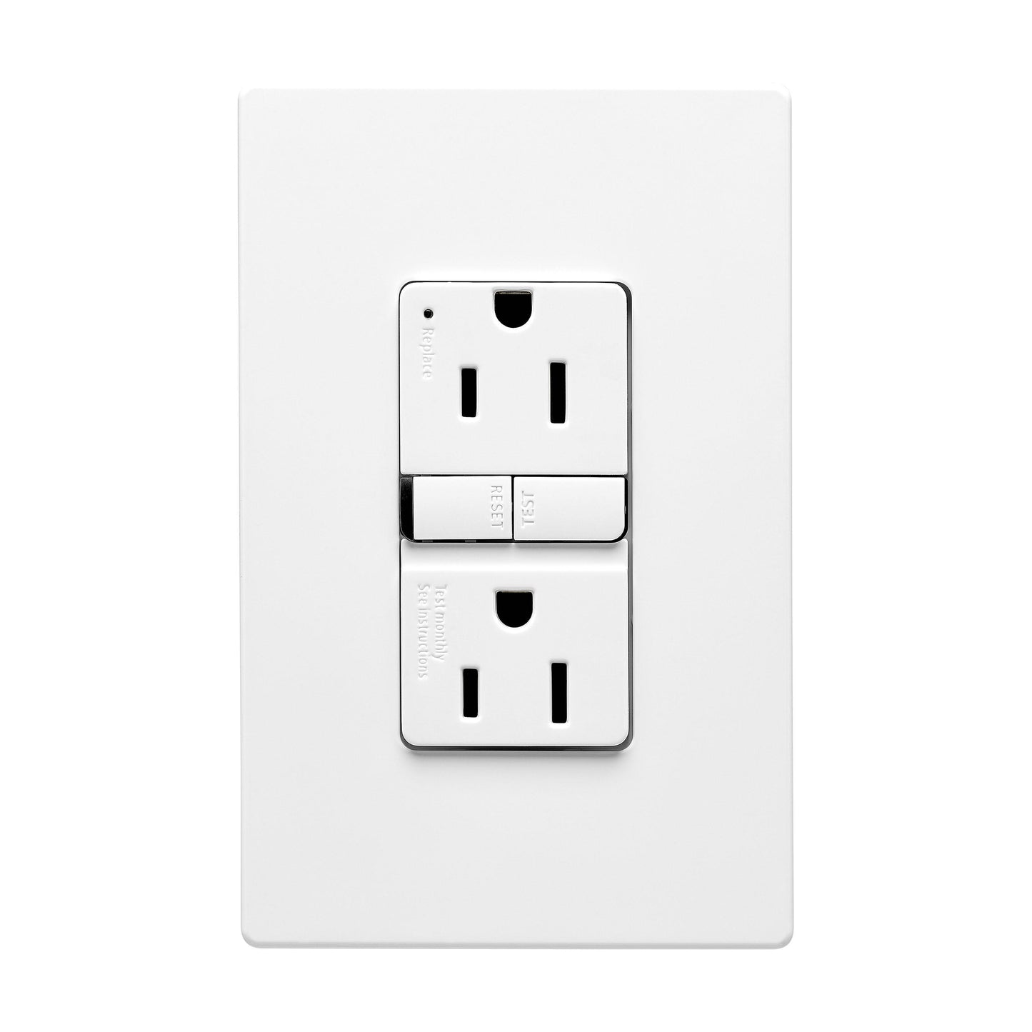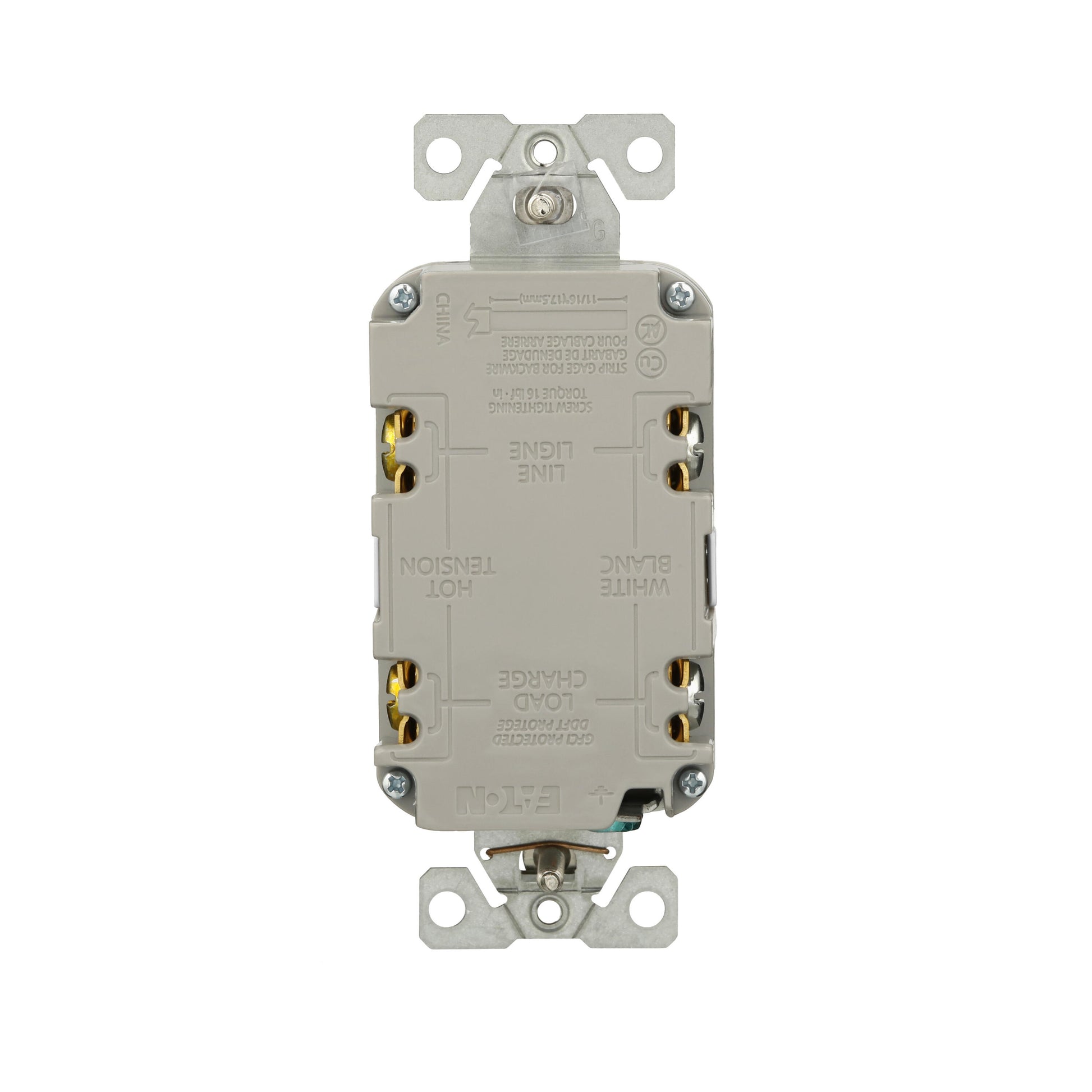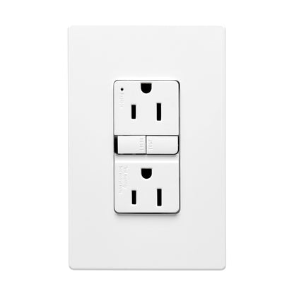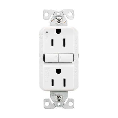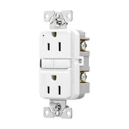 The Eaton TRGF15W is a tamper-resistant, self-test ground fault circuit interrupter (GFCI) designed for safety and reliability. With its slim design, this 15A, 125V device is perfect for residential, commercial, and industrial applications. The tamper-resistant feature ensures added safety, making it ideal for environments where electrical outlets are within reach of children. Eaton's self-test technology automatically ensures continuous protection by periodically testing the GFCI functionality. Its back and side wire configuration supports easy installation and reliable connections.